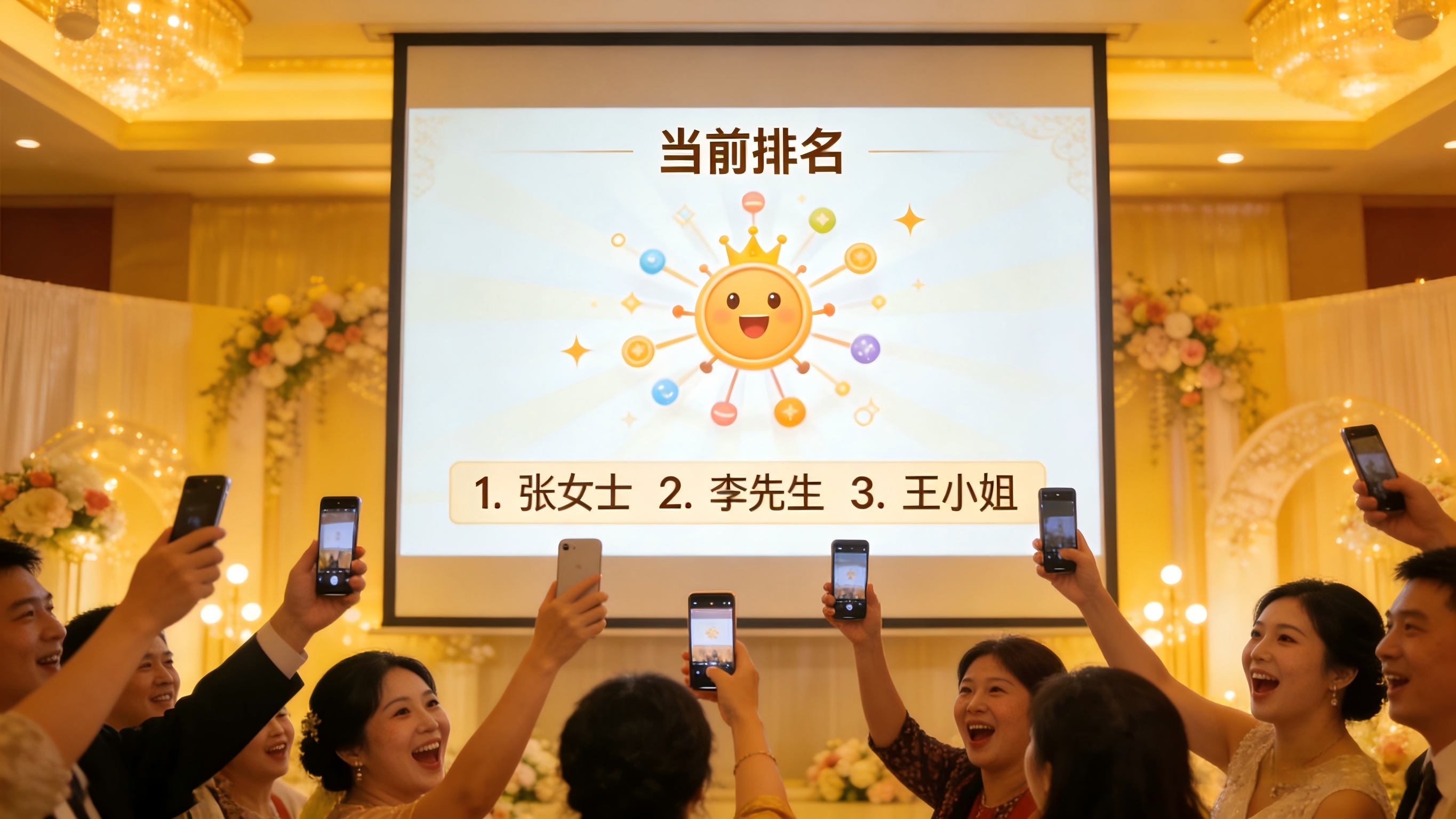 婚礼进行到中场互动环节,没有搞花里胡哨的复杂流程,司仪只是简单引导全场宾客拿出手机,扫码连接现场电子大屏幕,开启淘气互动的婚礼摇一摇互动。一开始大家还慢慢试探,跟着屏幕上的动画提示轻轻晃动手机,没过几分钟氛围就彻底热起来,不管是年轻亲友还是长辈,都跟着一起参与,大屏幕实时同步每个人的摇动排名,节奏轻快不拖沓,排名靠前的宾客能拿到提前准备好的实用小伴手礼,没有门槛、操作简单,全场宾客的参与感瞬间就提上来了,原本略显安静的现场,一下子变得热闹又喜庆。
