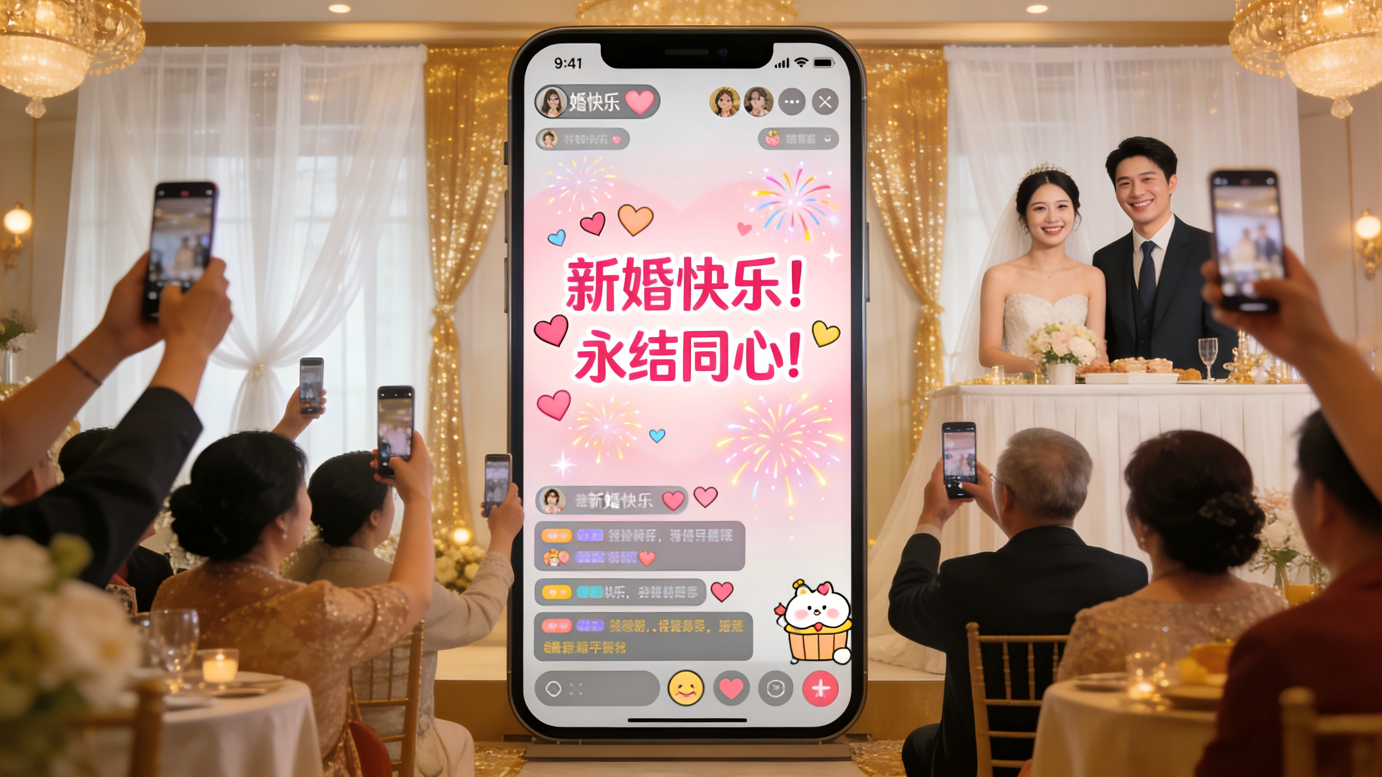 原本低头玩手机的年轻人最先抬头,纷纷拿出手机扫码,第一条祝福弹幕刚出现在大屏中央,紧接着越来越多的祝福语铺满整个屏幕,“新婚快乐”“百年好合”的字样滚动不停,还有人发了可爱的婚礼表情包,瞬间吸引了全场目光。